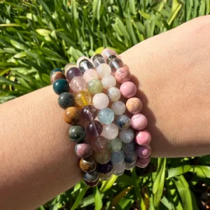 Seven Synergies 手链结合了用于精神成长和直觉的紫水晶、用于显现和放大的透明石英、用于接地和保护的烟晶石、用于加速和清晰的金红石、用于情感疗愈和心灵连接的针铁矿、用于转变和成长的针铁矿以及用于精神扩展和对齐的 Cacoxenite。佩戴它来提升您的能量,实现您的梦想,并在您的旅程中脚踏实地。